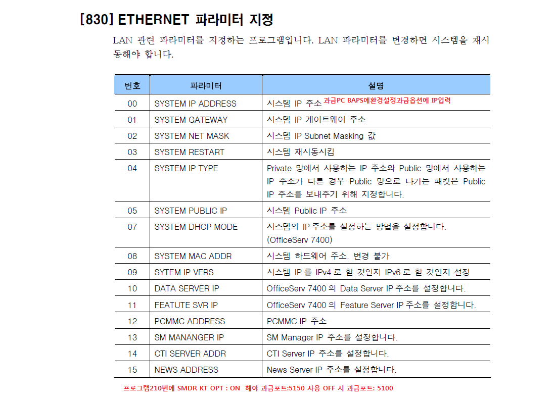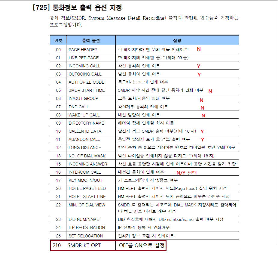 210번 SMDR KT OPT를 OFF에서 ON으로 변경